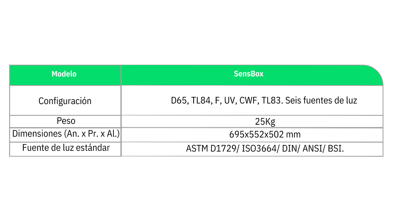 Es la Cámara de Iluminación ideal para un ambiente de evaluación visual precisa. Con SensBox no se preocupe más por las variaciones ambientales ya que podrá crear las condiciones adecuadas de iluminación. Cuenta con 6 diferentes tipos de iluminantes que puede elegir. Control Electrónico / Iluminantes de larga durabilidad / 6 diferentes Iluminantes (Daylight, TL84, F/A, UV, CWF, TL83/U30)