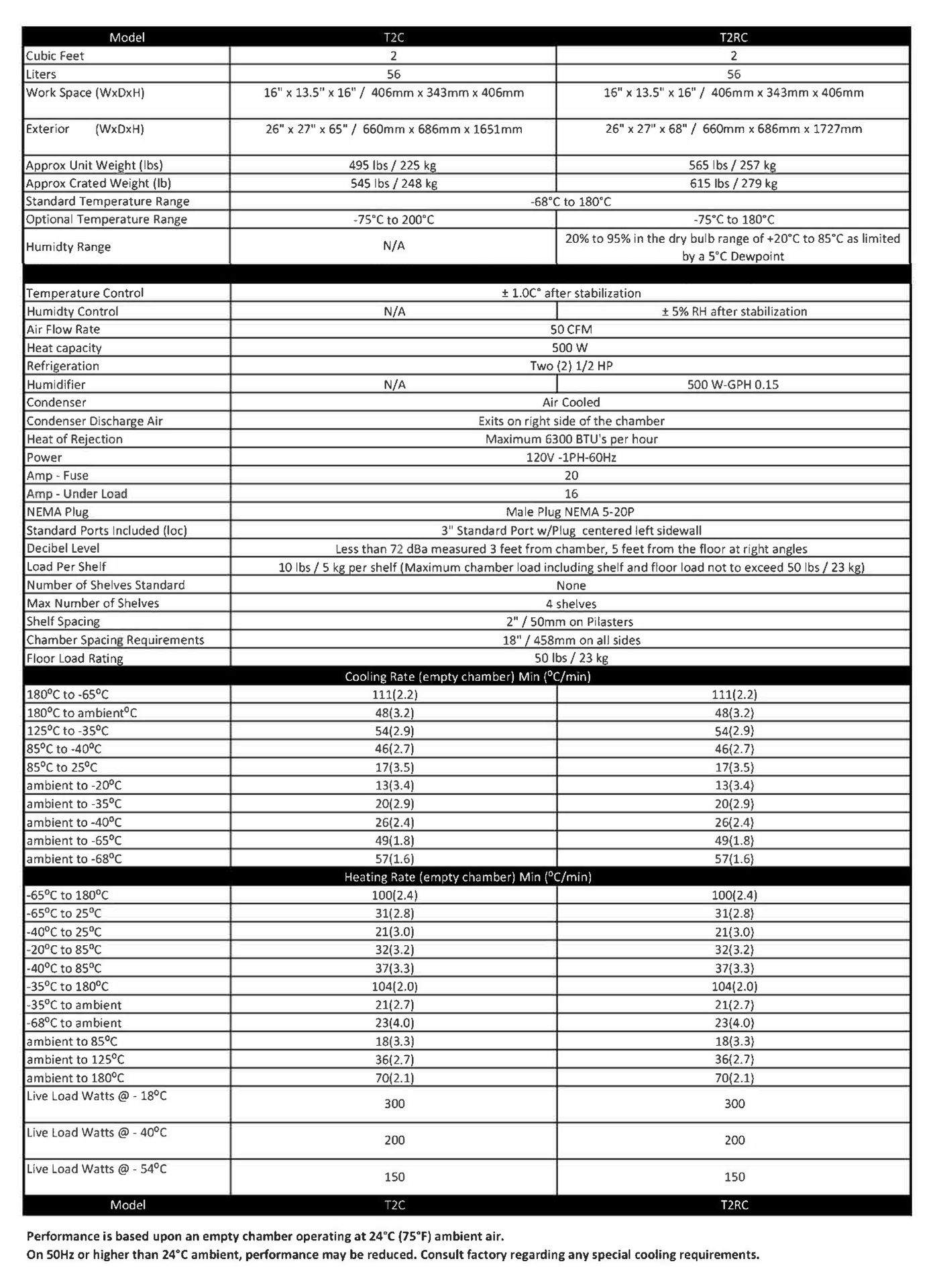 - En una temperatura ambiente de 50 Hz o superior a 24 °C, el rendimiento puede verse reducido. Consulte a la fábrica sobre cualquier requisito especial de enfriamiento. En todas las cámaras Tenney se utilizan exclusivamente refrigerantes sin CFC.