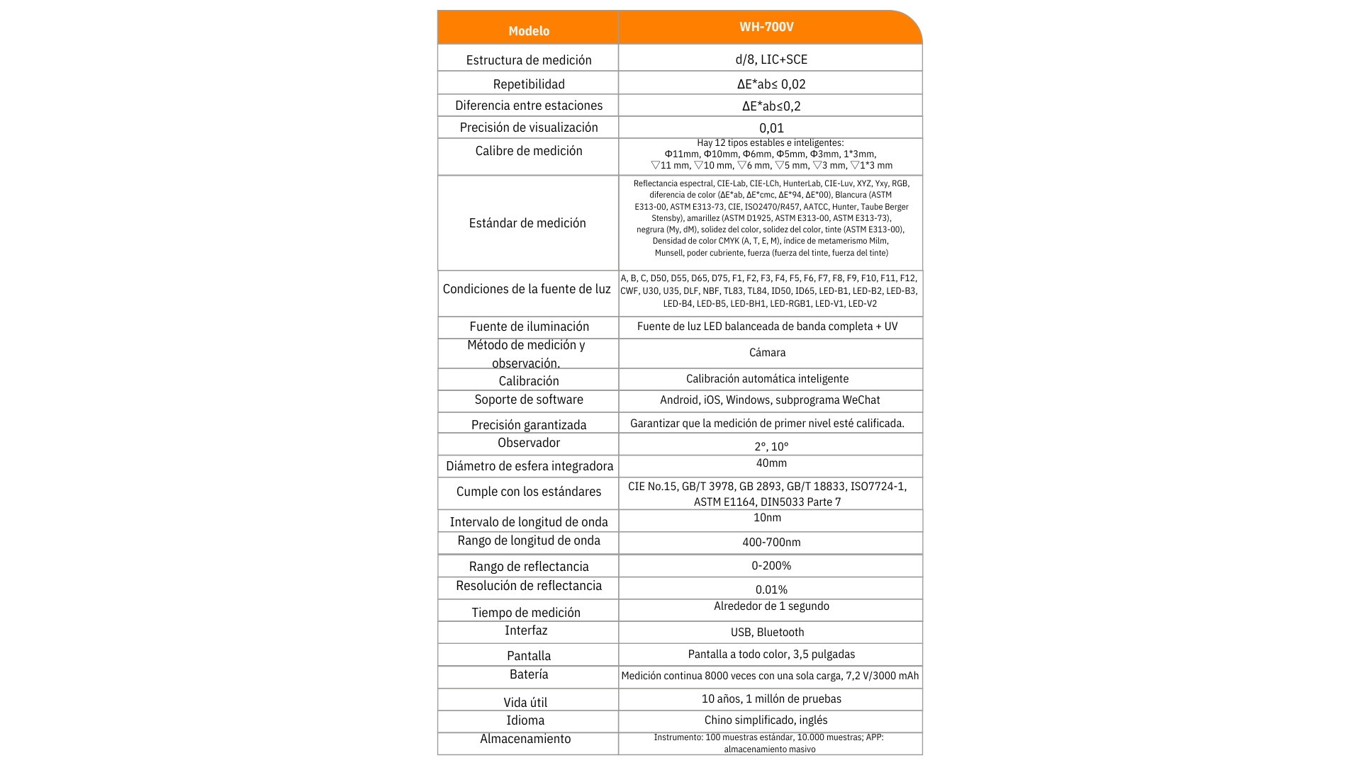 Cuenta con Calibración automática, 12 areas de medición, 30 parámetros de medición y 40 fuentes de luz de evaluación. Repetibilidad ΔE*ab≤ 0.02, Acuerdo Inter-instrumental dentro de ΔE*ab≤0.2