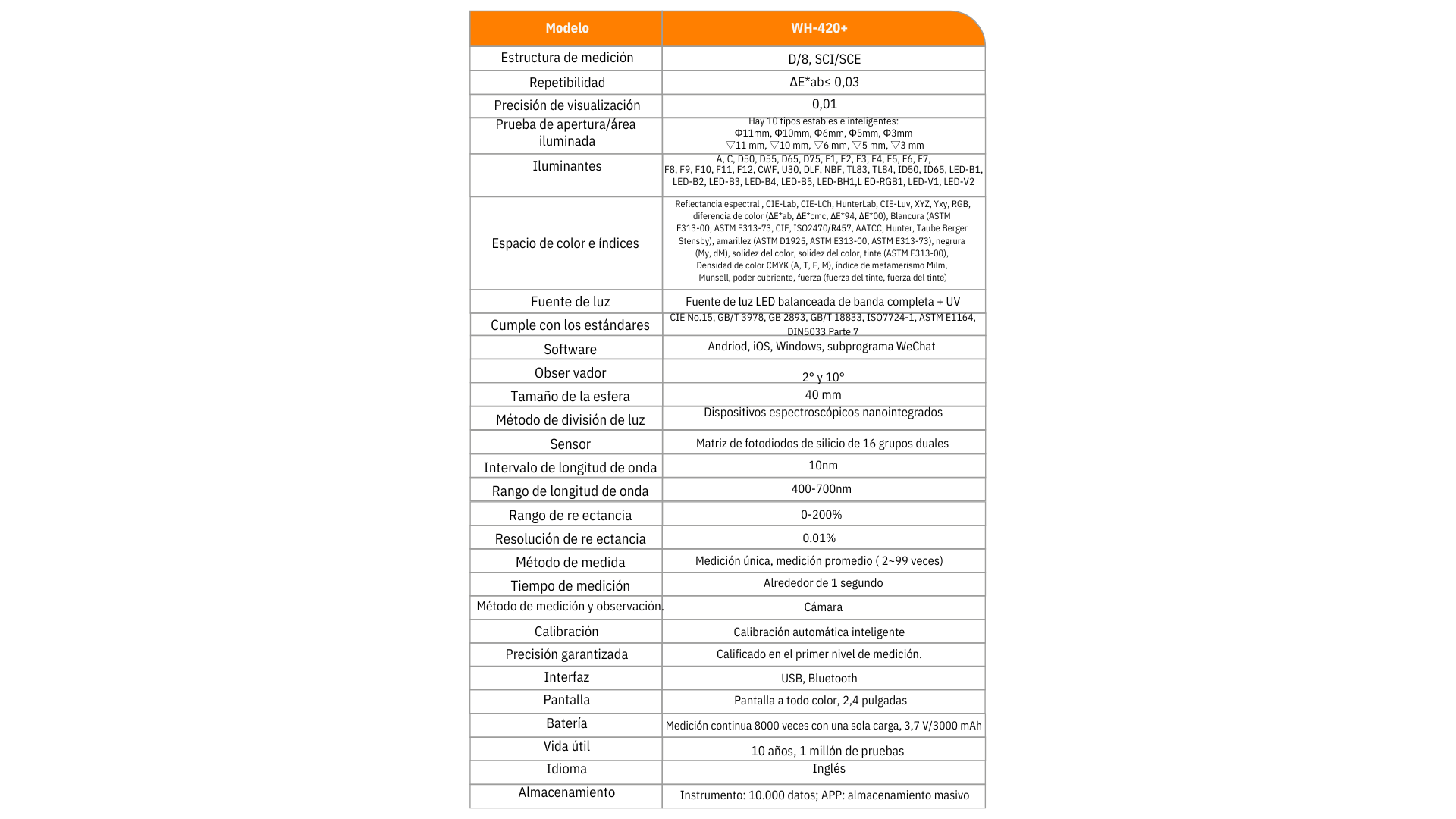 Es un Espectrocolorímetro Portátil que es adecuado para la evaluación de la diferencia de color de los productos, cuenta con una excelente repetibilidad superior dE*ab ≤ 0.03, admite 10 tipos de áreas de medición, el instrumento adopta el método de calibración automática, tiene mas de 30 tipos de parámetros de medición y 40 tipos de fuentes de luz estandar, además cuenta con Luz UV.